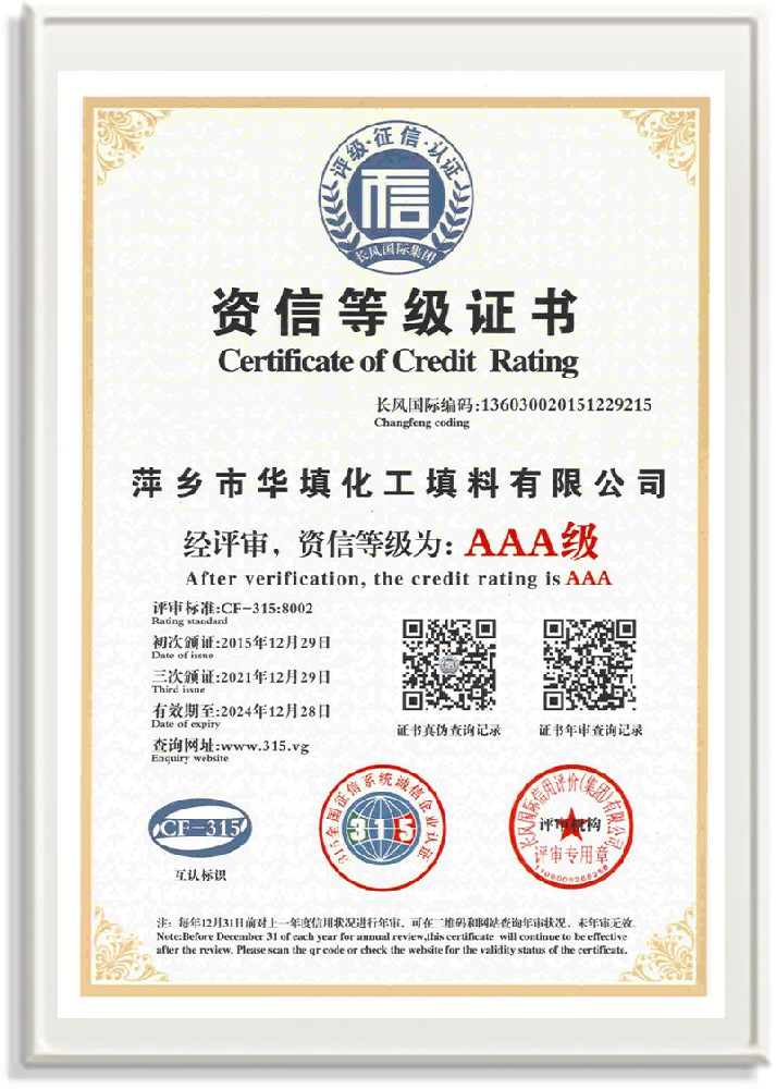 萍鄉(xiāng)市華填化工填料有限公司,位于320國道、109國道、浙贛鐵路、昌金高速公路貫穿其中,交通便利,是江西西部一顆燦爛明珠,創(chuàng)建于20世紀70年代初期,是中國石油天然氣股份有限公司“能源一號網(wǎng)”會員企業(yè)、中國石化物資采購電子商務網(wǎng)絡和中國海洋石油總公司采辦業(yè)務系統(tǒng)成員單位,是上海大學江西材料基因組工程產(chǎn)業(yè)研究院工業(yè)陶瓷產(chǎn)業(yè)創(chuàng)新聯(lián)盟基地,且通過ISO9001:2015質(zhì)量管理體系、ISO14001:2015環(huán)境管理體系、ISO45001:2018職業(yè)健康安全管理體系認證的化工填料生產(chǎn)企業(yè)。公司擁有陶瓷、塑料、金屬填料、催化劑、活性氧化鋁、分子篩等產(chǎn)品生產(chǎn)線,現(xiàn)有固定資產(chǎn)3616萬元,占地面積3.8萬平方米。公司具有悠久的生產(chǎn)歷史、雄厚的技術力量和先進的生產(chǎn)工藝設備,可生產(chǎn)工業(yè)瓷球(支撐劑)、陶瓷、金屬、塑料質(zhì)的規(guī)整、散堆化工填料及分子篩、催化劑、生化濾料、活性氧化鋁、石化助劑、活性炭、環(huán)保材料、耐火材料等系列的200多種規(guī)格型號產(chǎn)品。